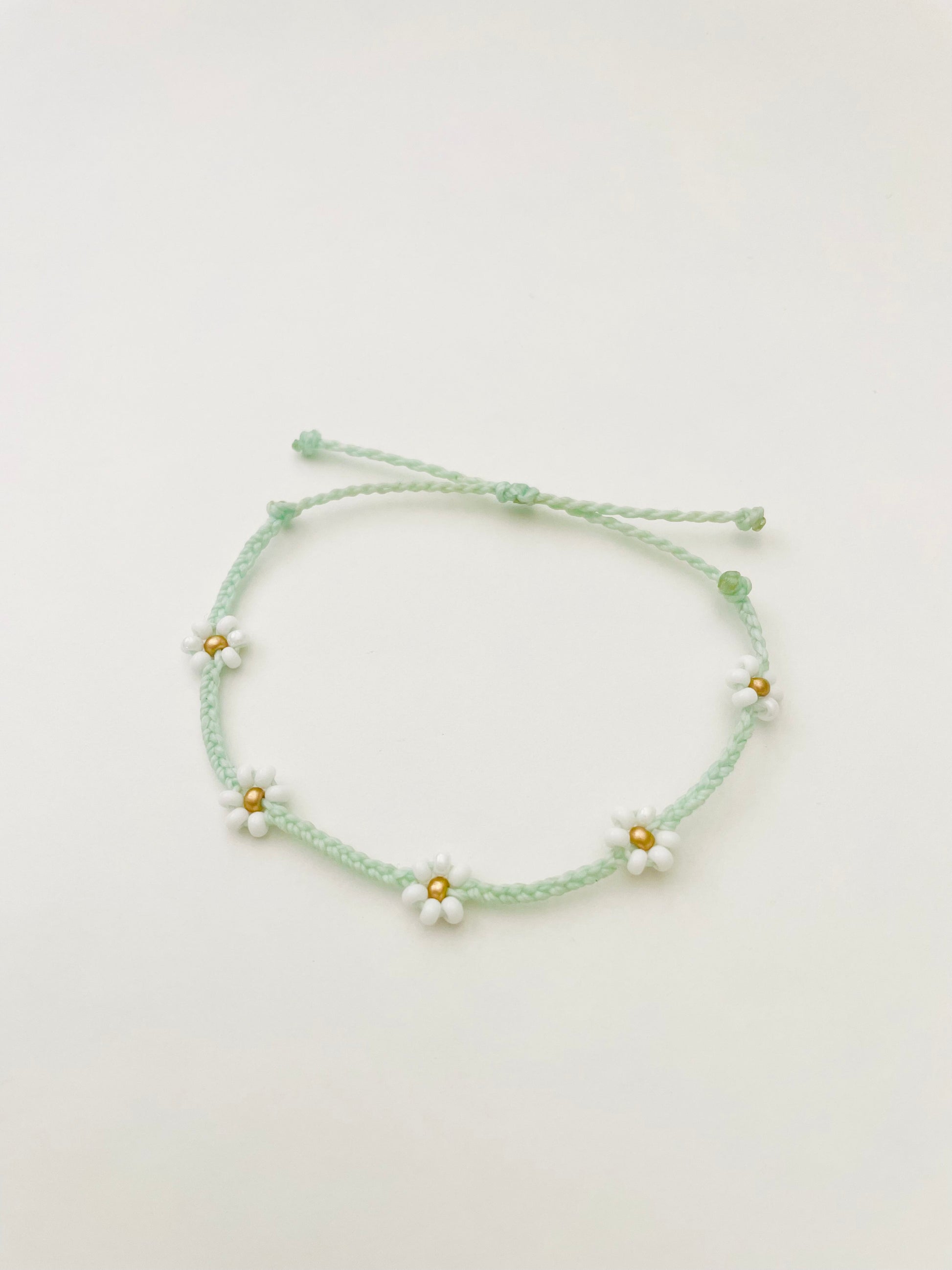 This super cute daisy bead bracelet is adjustable to fit most wrist sizes! It is made with waterproof wax-coated polyester cord and is great for everyday wear. It is great to wear simply by itself or stacked with other bracelets!