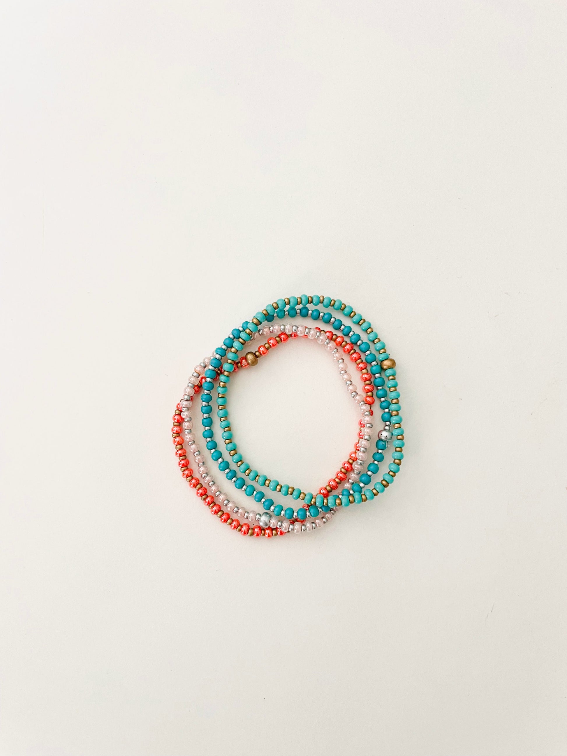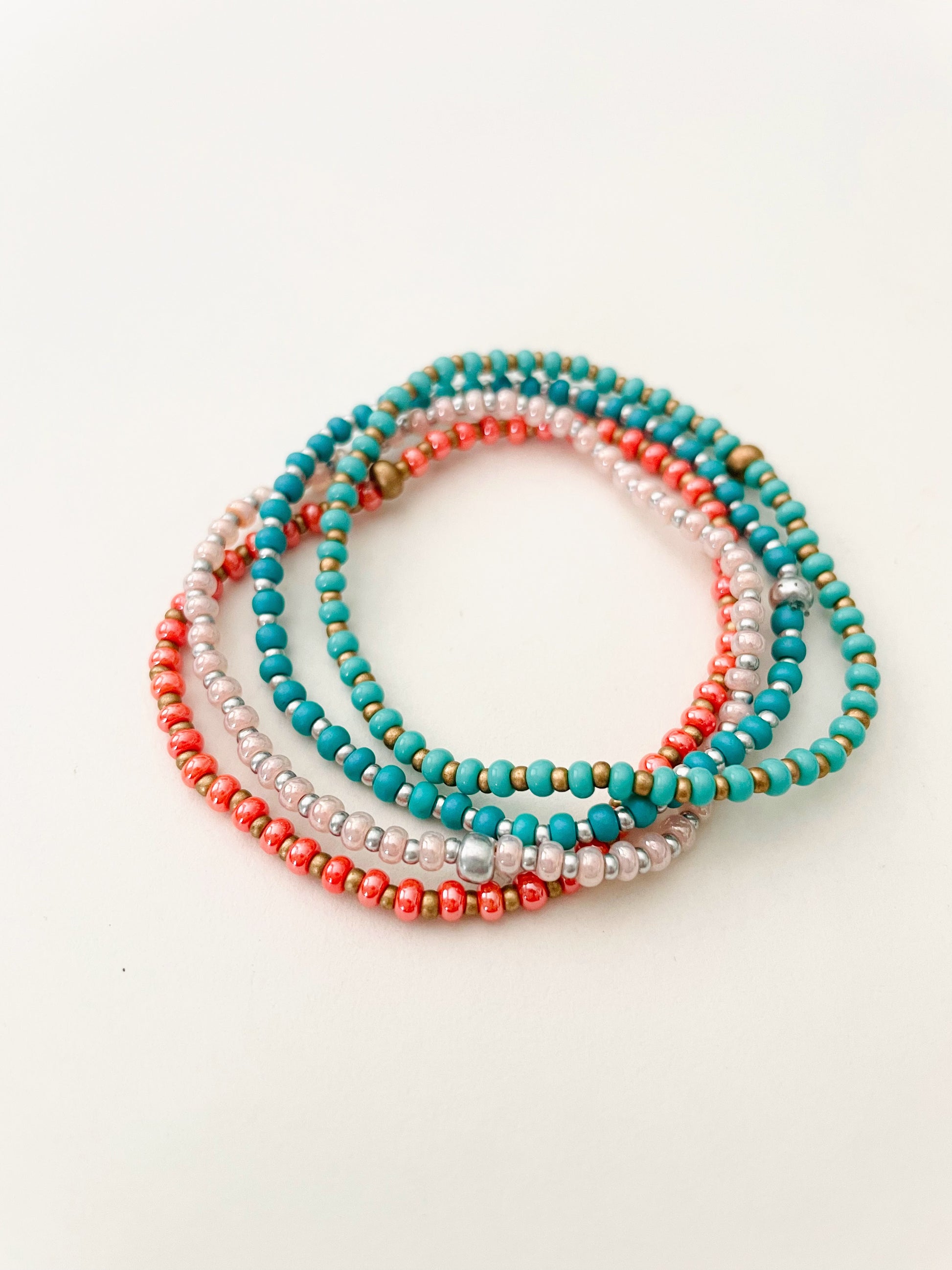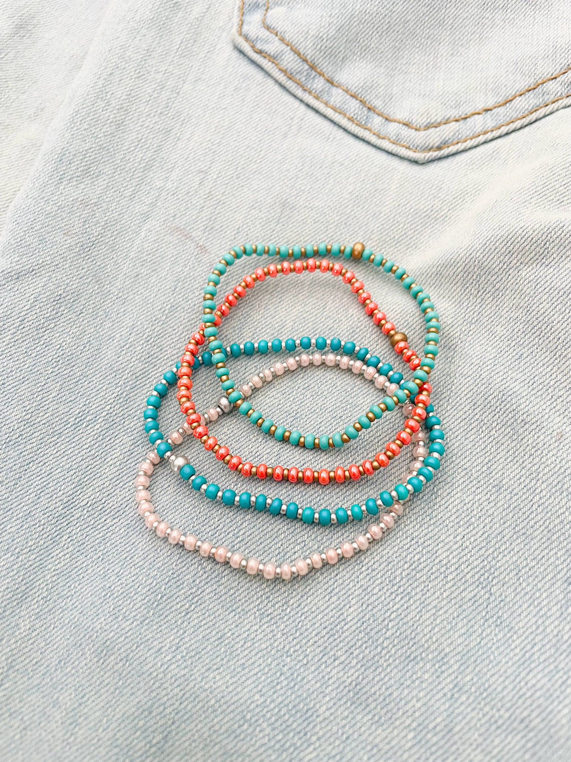 These beachy beaded stretch bracelets are perfect for any occasion! They are made with high-quality beading elastic so they are easy to slip right on your wrist. Choose your favorite color or get the full set option!