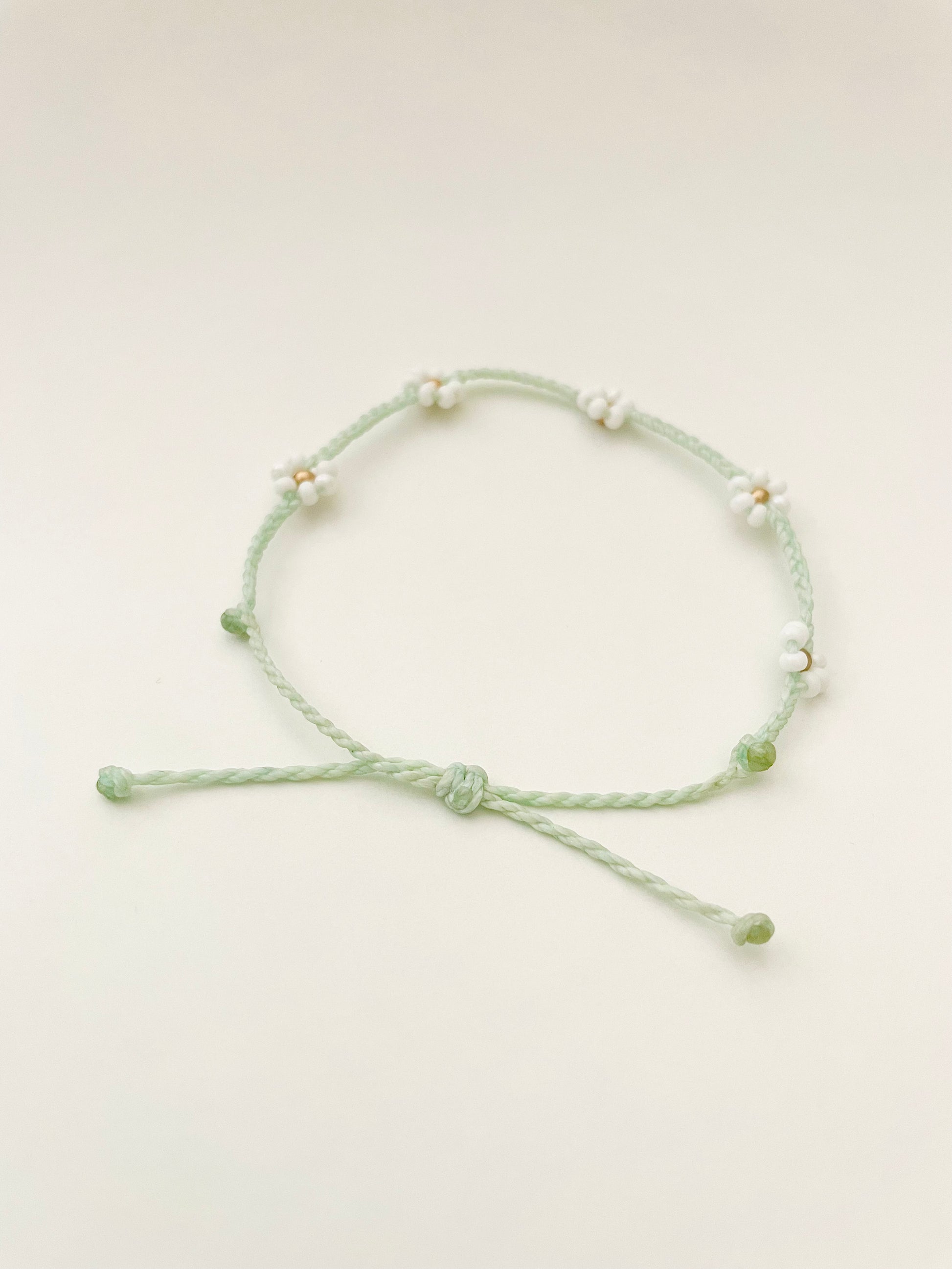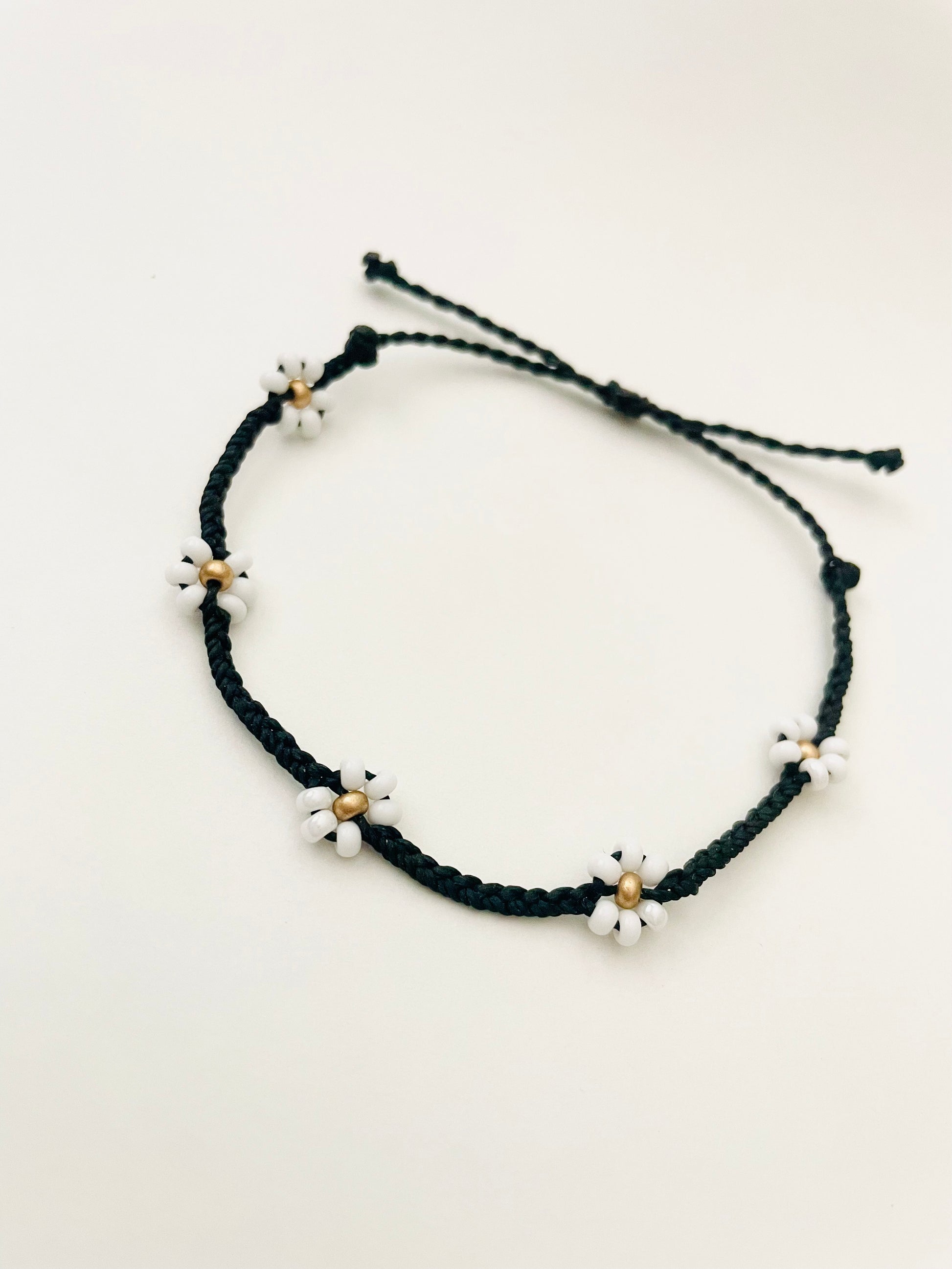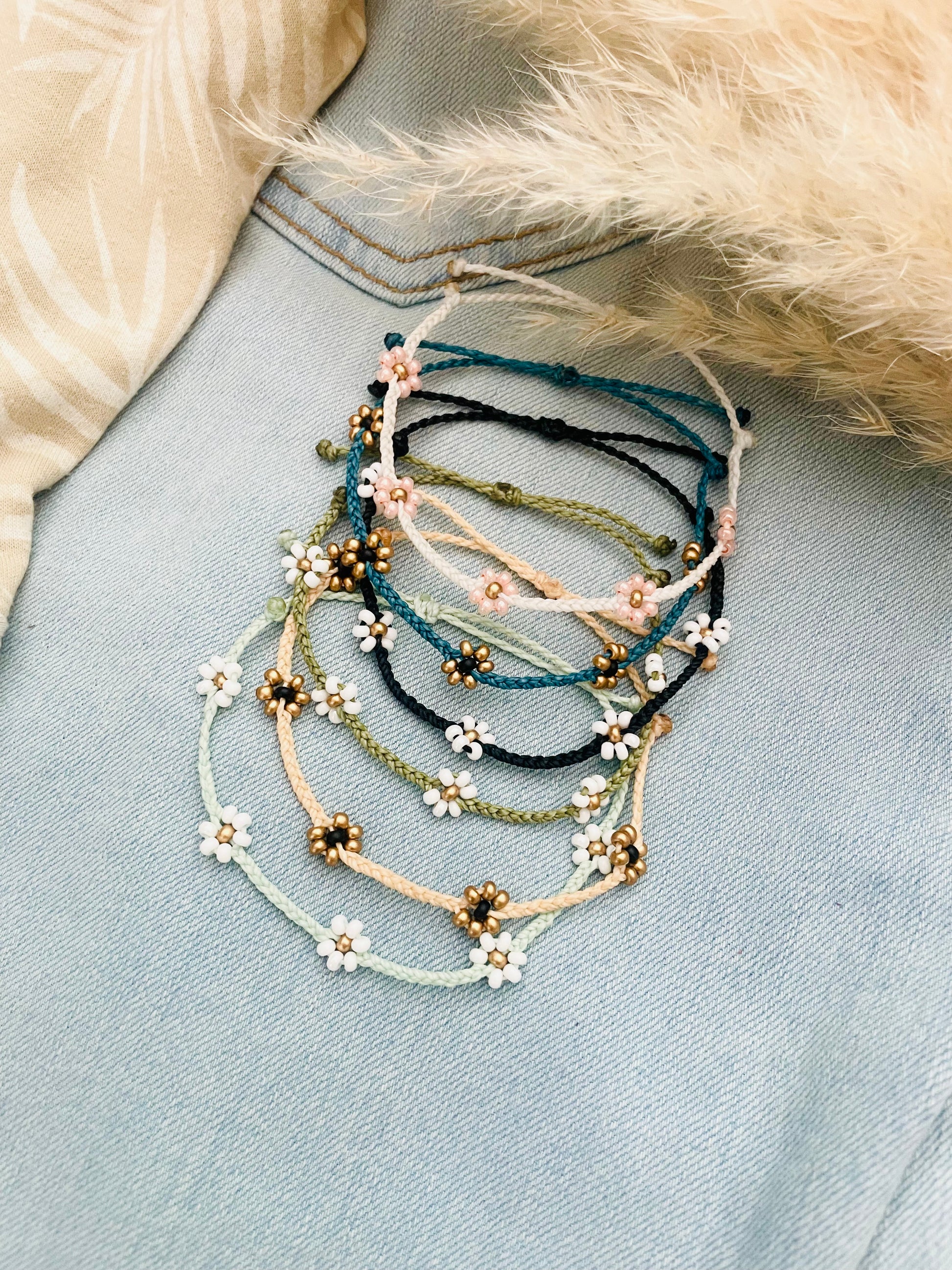 These super cute daisy bead bracelets are adjustable to fit most wrist sizes! They are made with waterproof wax-coated polyester cord and are great for everyday wear. Stack them with other bracelets, or wear them by themselves!