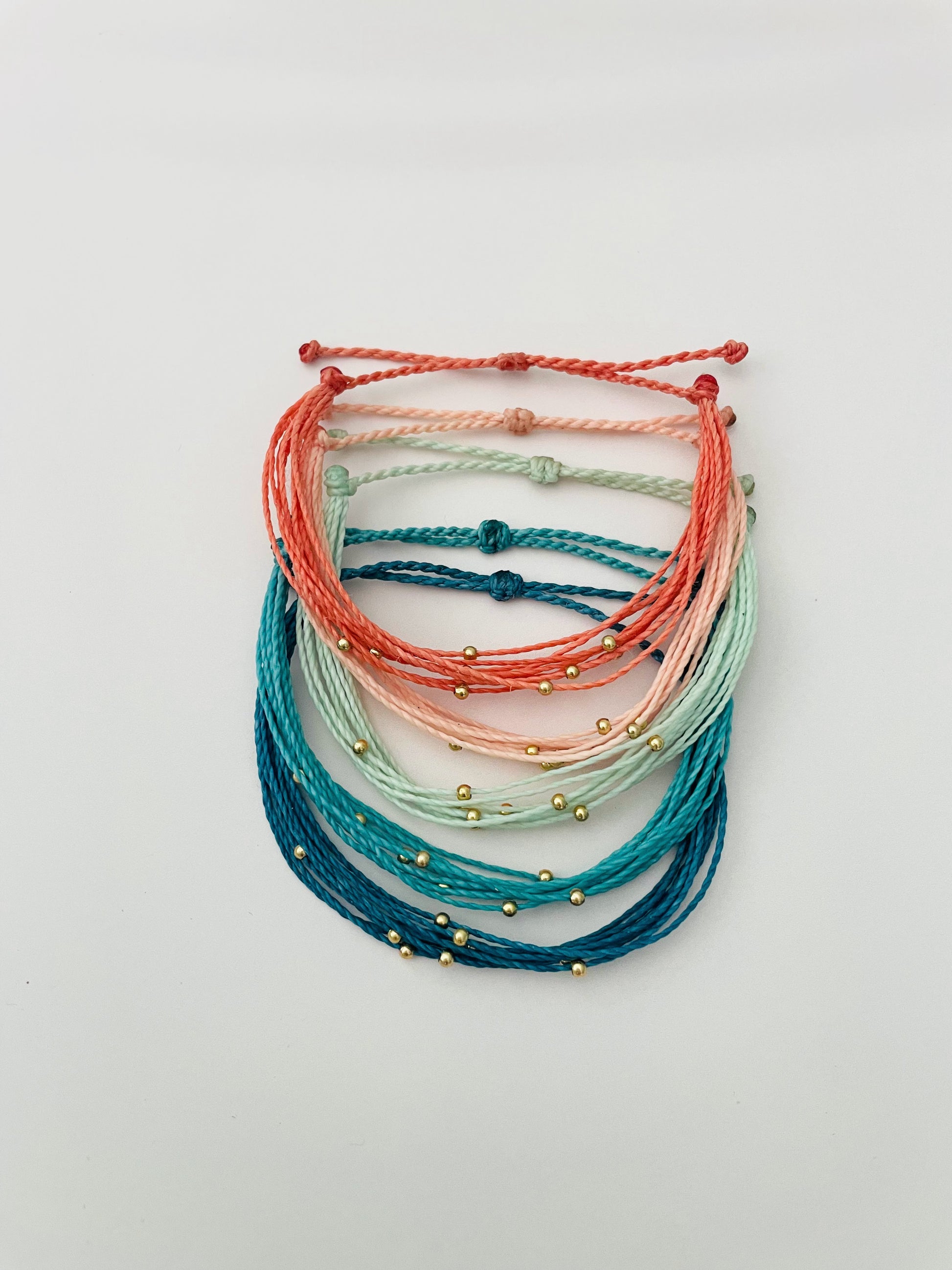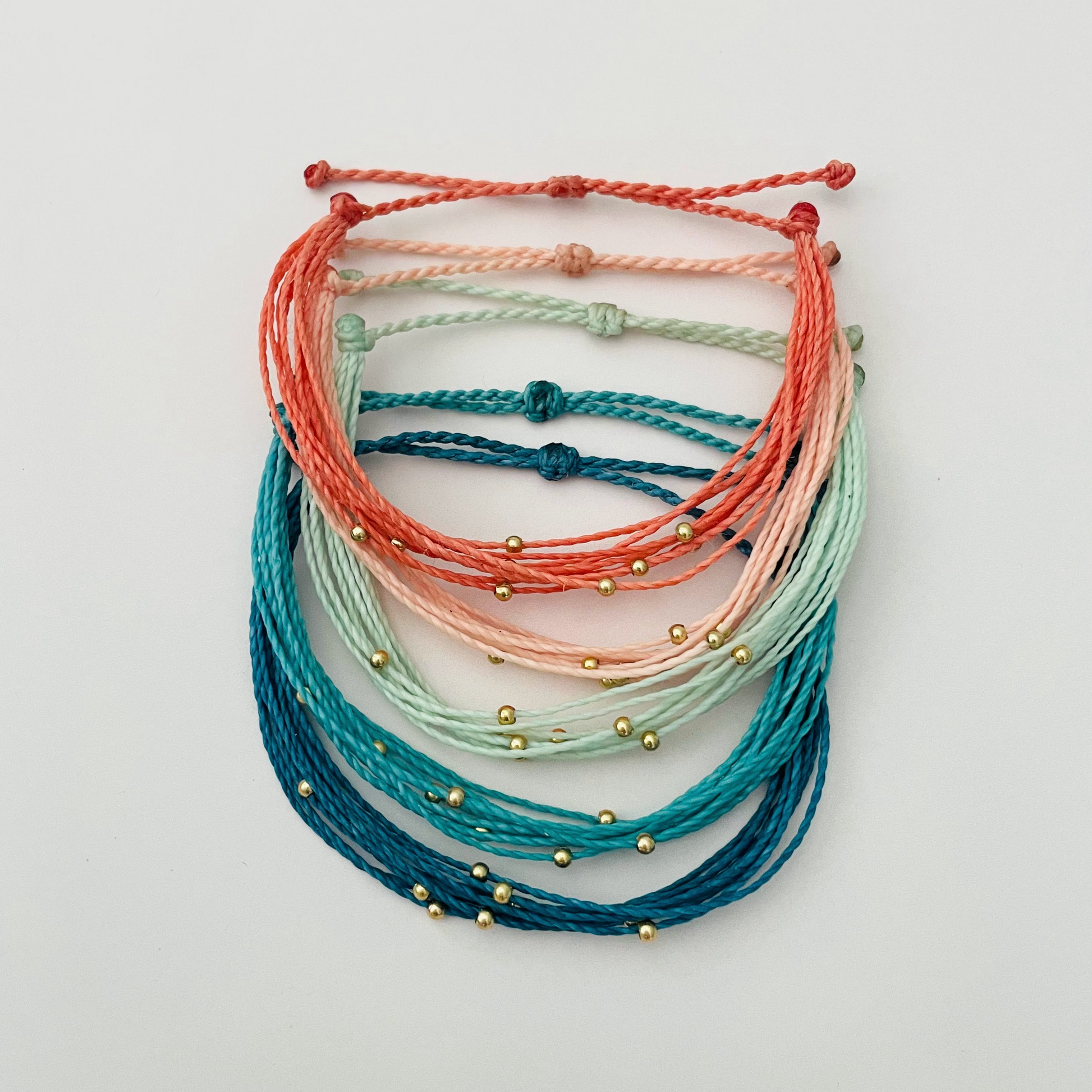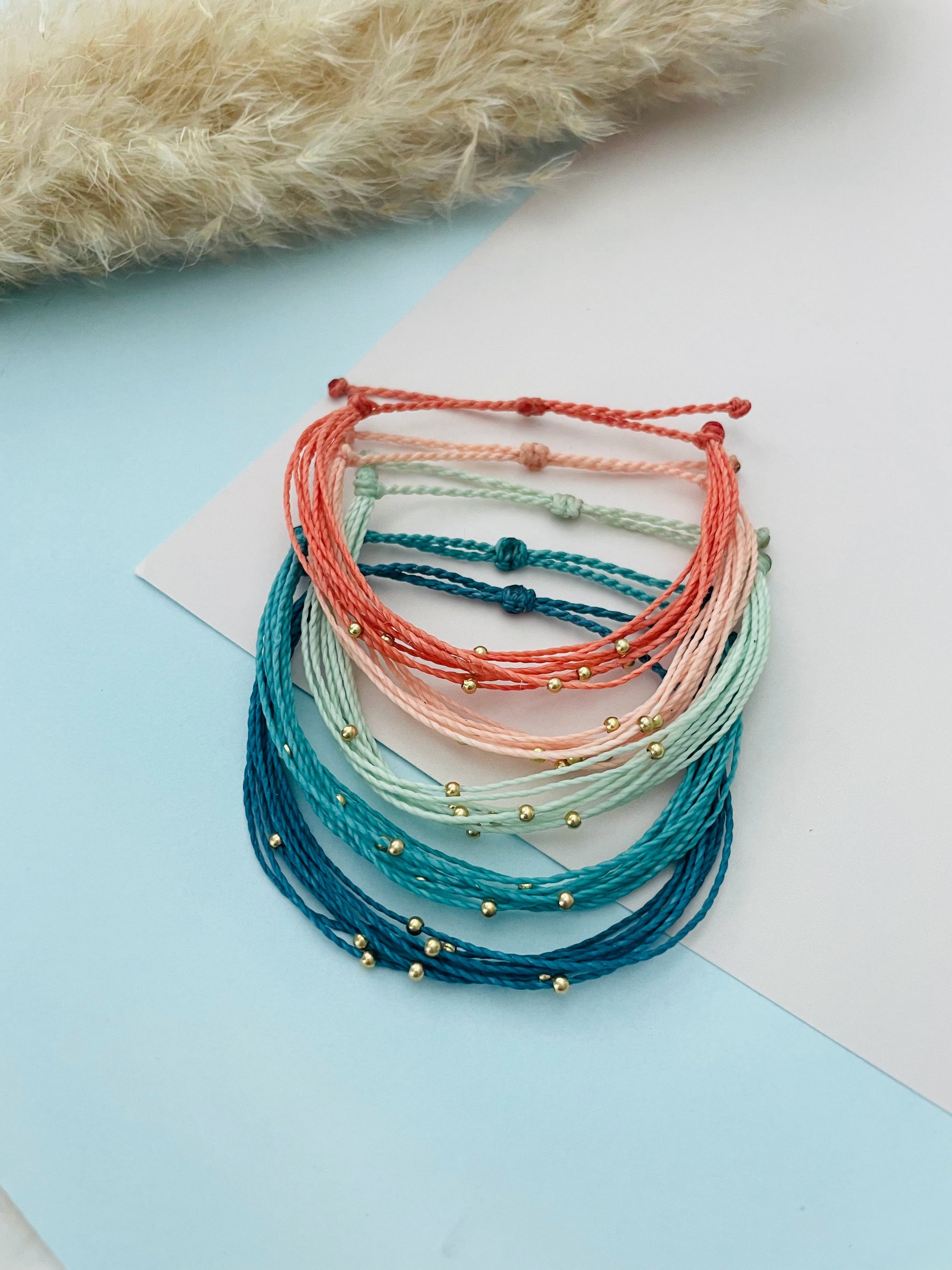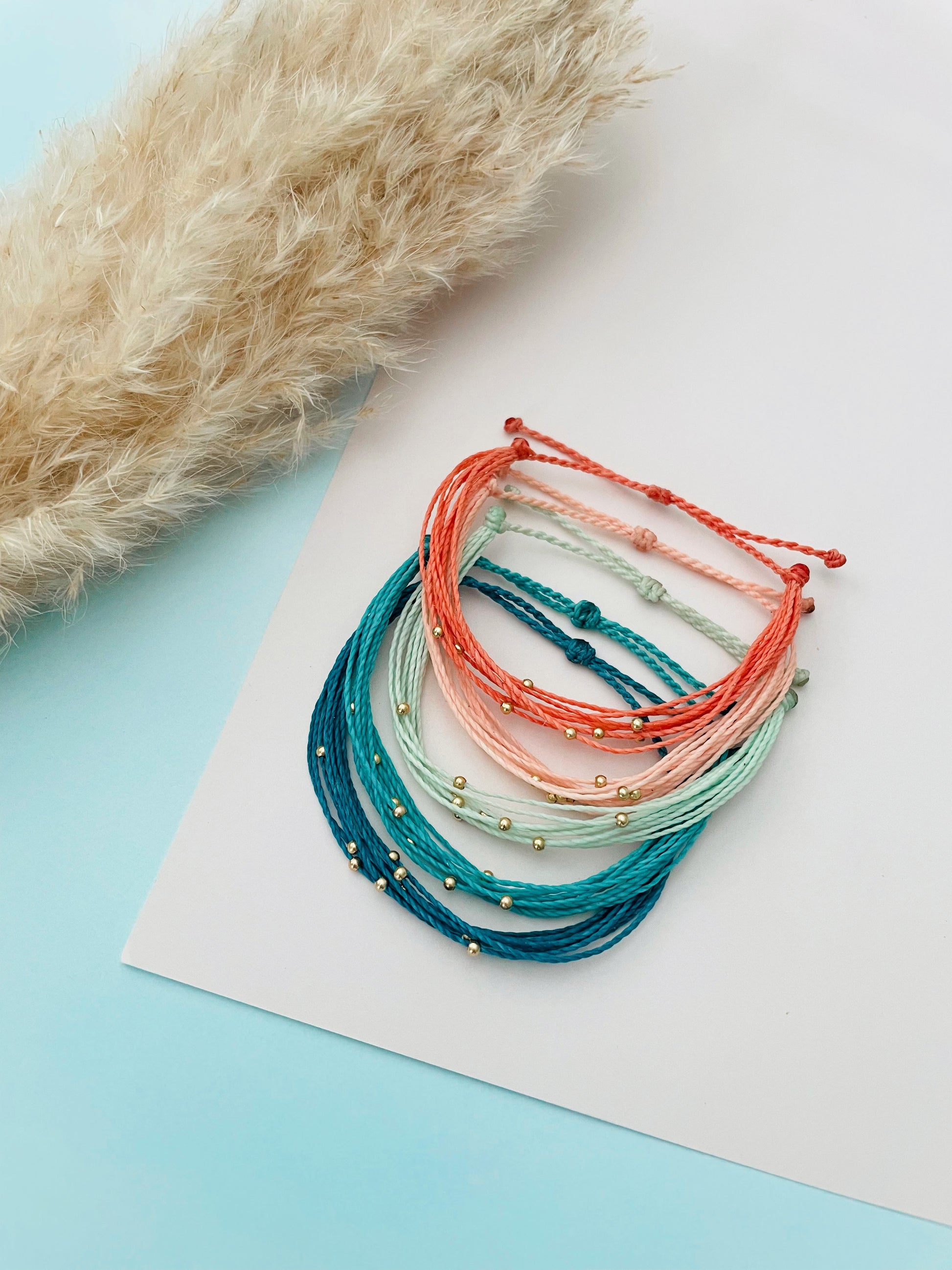 These cute & simple string bracelets are made with waterproof wax-coated polyester cord & gold-filled beads. They are also adjustable to fit most wrist sizes and are perfect for everyday wear!