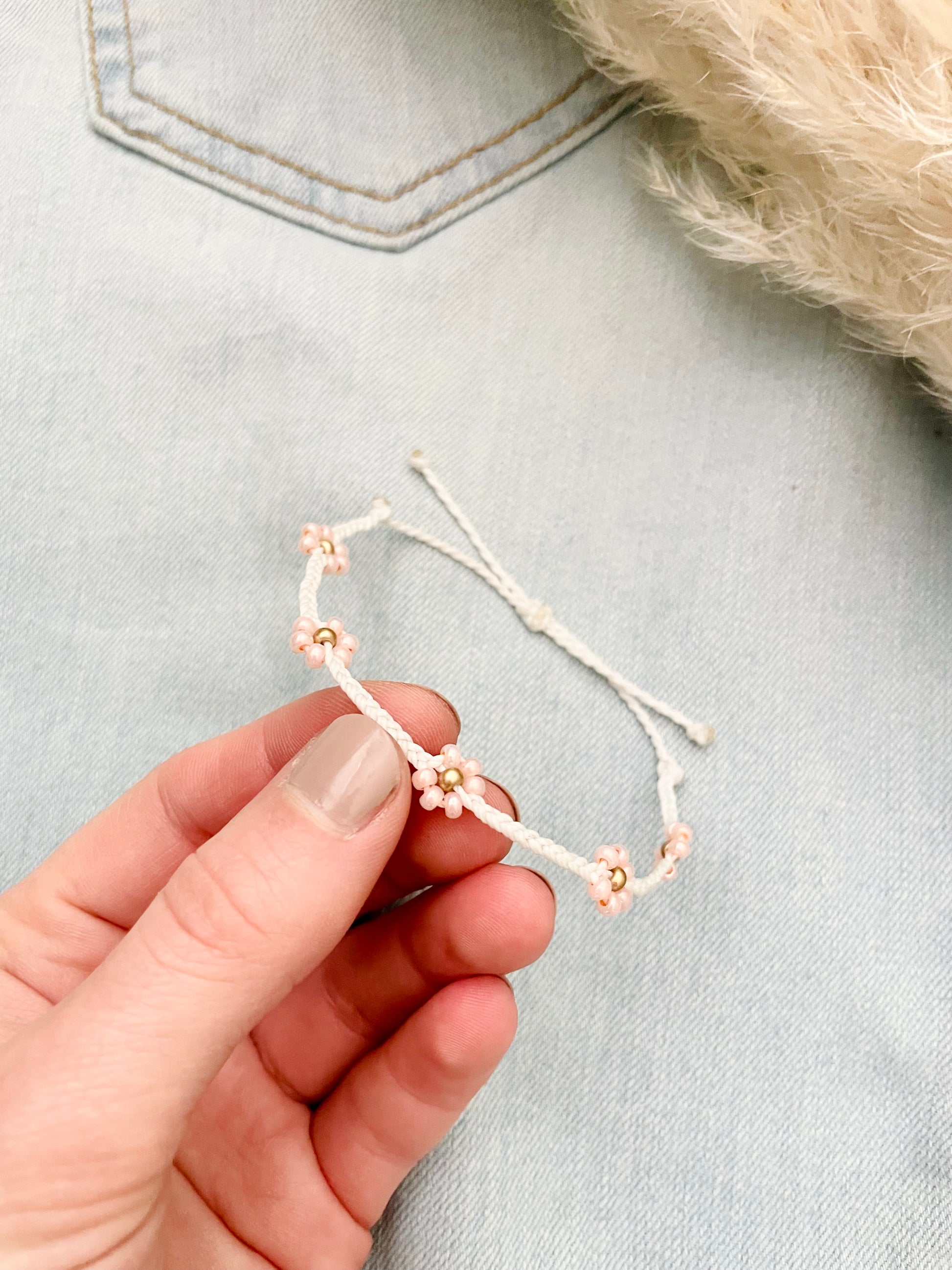 This super cute daisy bead bracelet is adjustable to fit most wrist sizes! It is made with waterproof wax-coated polyester cord and is great for everyday wear. It is great to wear simply by itself or stacked with other bracelets!